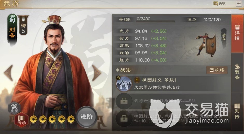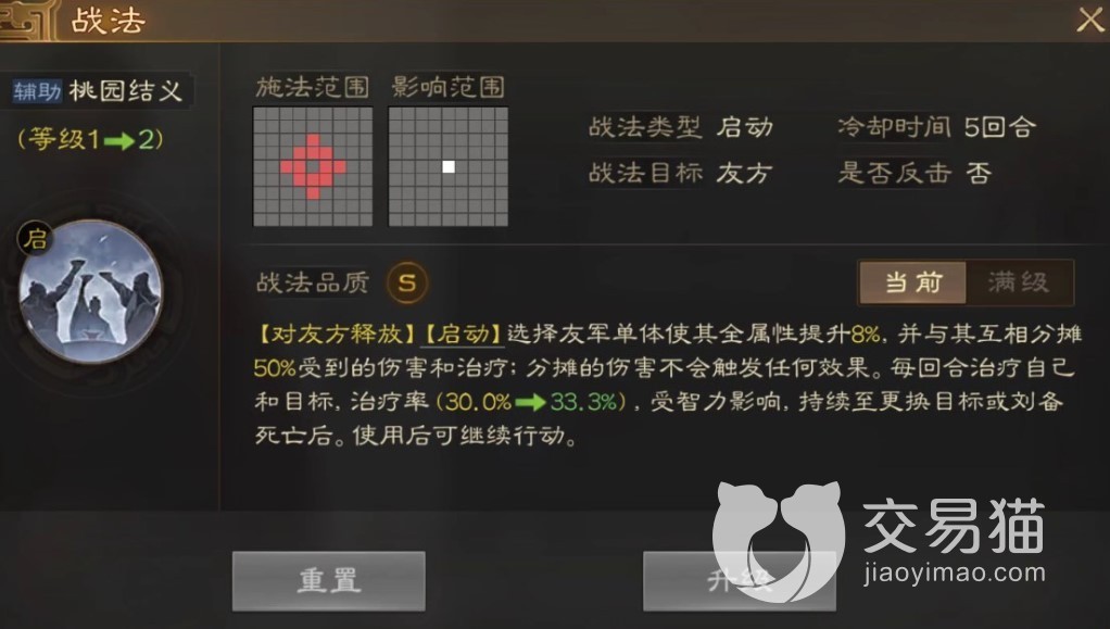不得不说刘皇叔的立绘还是很有辨识度的,还带着淡淡的微笑,满脸仁德。从属性方面看统帅与魅力值非常高,而其属性也是都属于中上水平,非常均衡。携带兵种方面默认是盾兵。自带的战法自然是“桃园结义”,5×5的十字型施法范围,可以对右方单体施放令其全属性上升8%,并分摊一半其受到的伤害与治疗,分摊伤害大多时候还是挺常见的,但分摊治疗就比较有意思了。注意这里只是单纯的分摊伤害量或治疗量,并不会继承其他特殊效果。与此同时该战法还可以在每回合治疗自己和目标,治疗量受智力影响,该效果会一直持续到更换施法目标或者是刘备阵亡。而且在使用了该战法后还可以接着行动。其实这个技能看上去就有点像一些RPG游戏里的链子,将刘备与目标锁定,可以是输出友军,分摊伤害与治疗,可以大大提升友军的生存。
