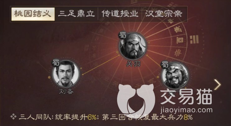 然后我们看看同队加成也就是三国游戏里常见的羁绊设定,与关张一起出战会提升统帅率并且在第3回合自动恢复兵力。与孙曹一起出战全属性提升15%。与公孙瓒、卢植一同出战从第四回合开始自身伤害提升15%。与刘晔、仙帝、刘婵一同出战每回合也可以恢复自身最大兵力6%。综合考虑加成效果以及同队成员的定位,比较推荐与关张同队。