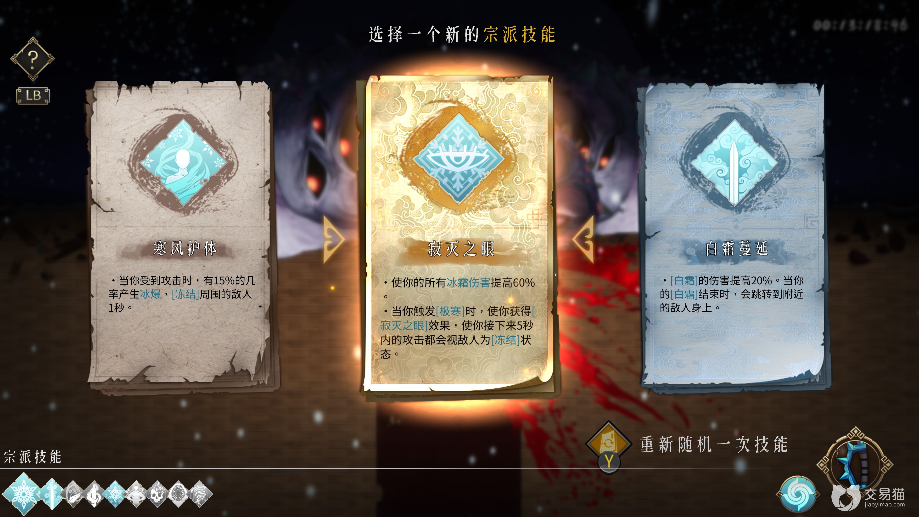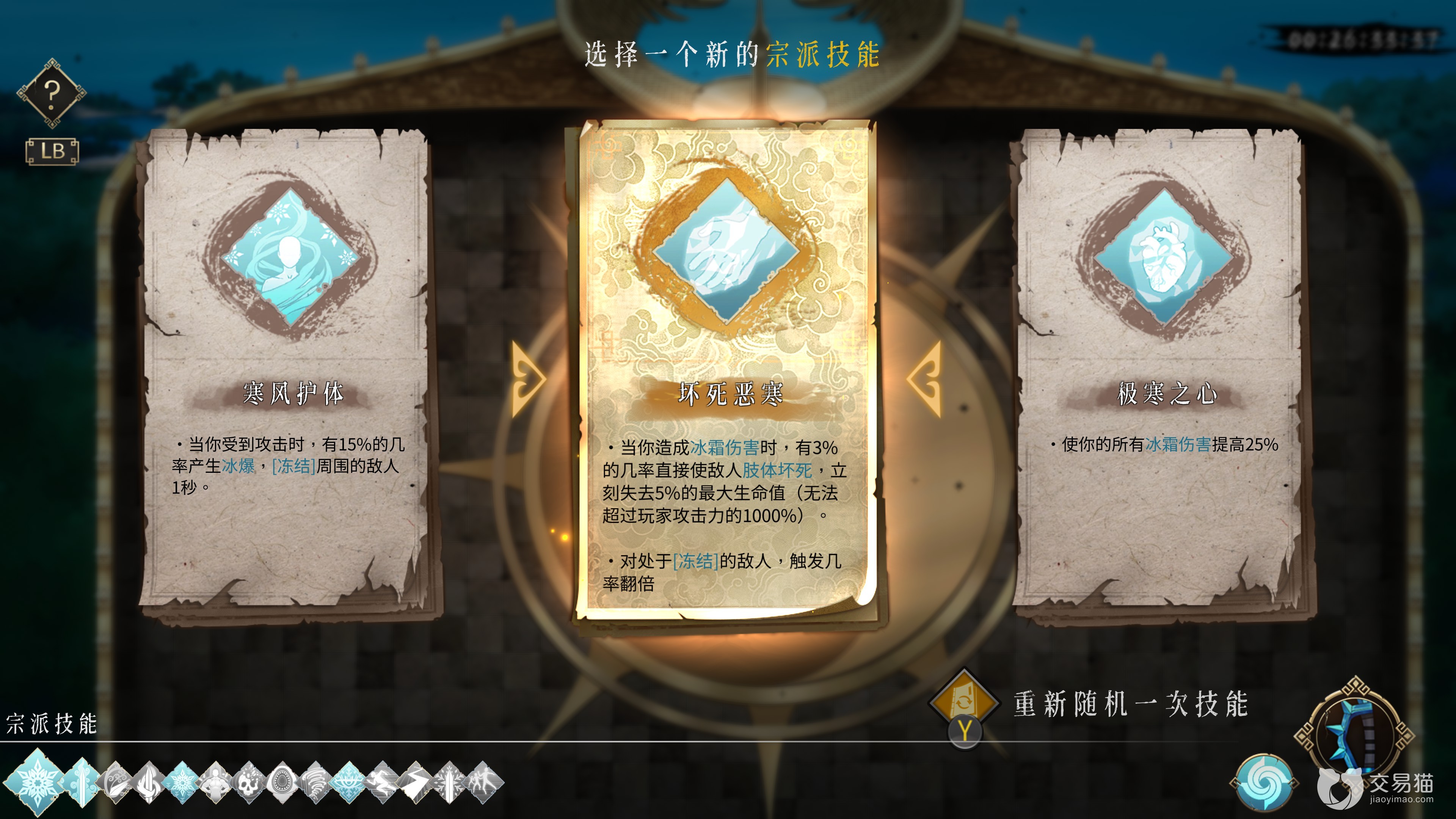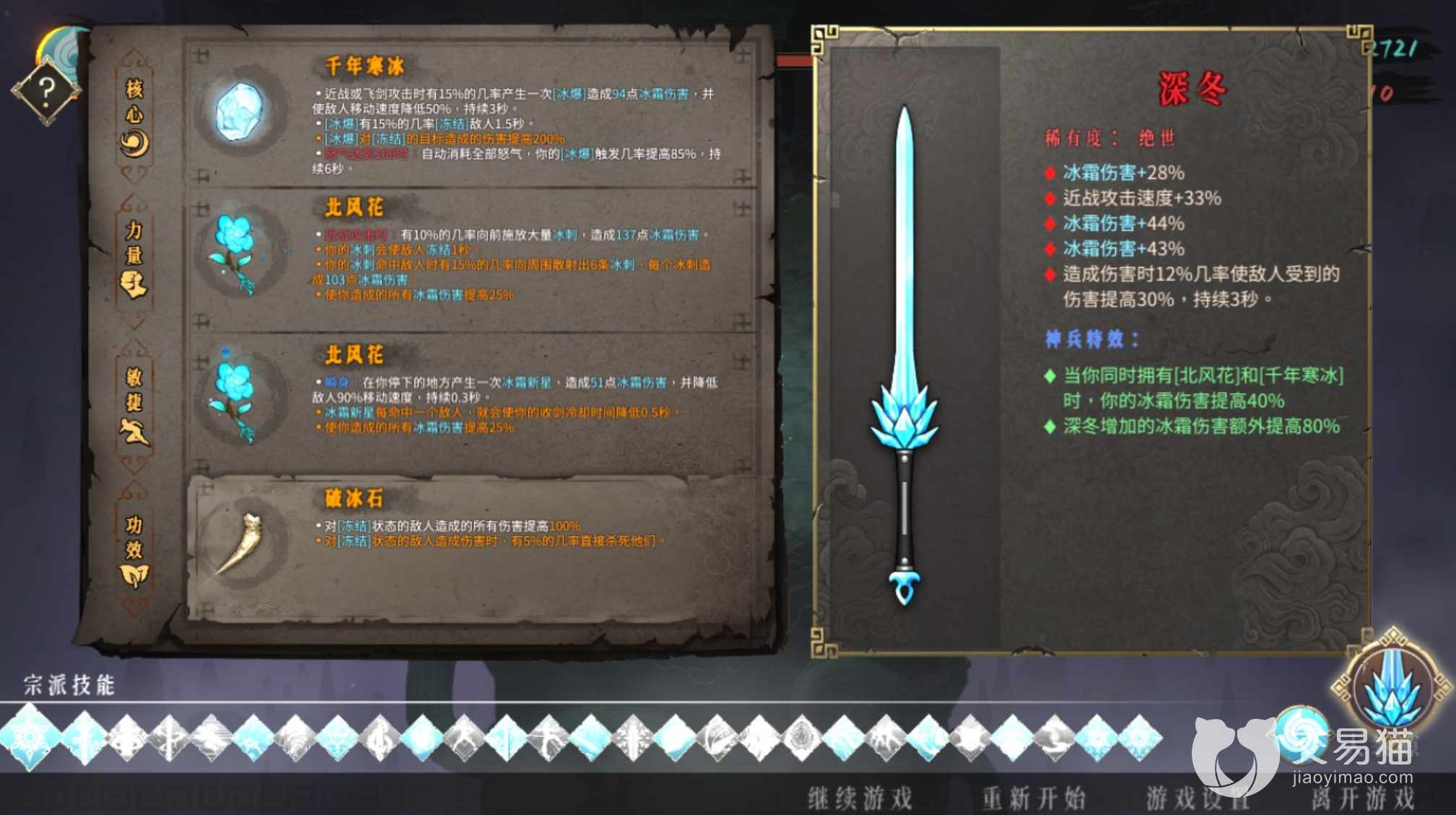 天赋的抓取,冰的玩法抓取的流派技能非常的丰富,近战选择优先攻击攻速,【狂风之刃】可以让玩家有80%的攻速提升,在游戏当中表现非常的明显,有和没有手感差距巨大,门派专属的技能选择【极速冷却】减少收剑的技能cd能更加频繁的触发冰爆的效果,【寂灭之眼】增伤核心的技能,见到秒选的技能之一60%冰伤非常强大,【坏死恶寒】主要用于对抗高血量的敌人和boss,百分比的血量伤害非常的强大,之后找【蛭牙】等恢复血量的技能保证续航,最后就是冰伤的技能最为重要,全靠冰伤的加成打伤害,离开了这个这个流派走不远。