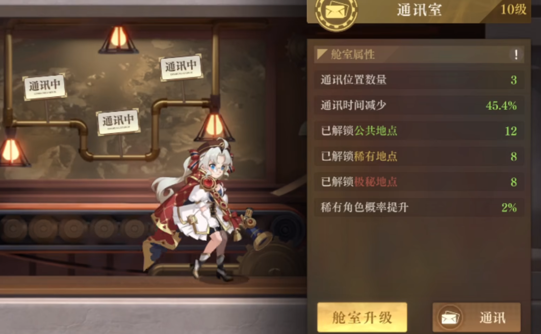 其次,就是尽量选择18小时的极秘地点,地点的选择优先高于词条。还有一个小技巧就是玩家可以优先升级7级舱室,开出三个通讯点,再使用高稀有度的舱室角色可以大量减少通讯所需时间。