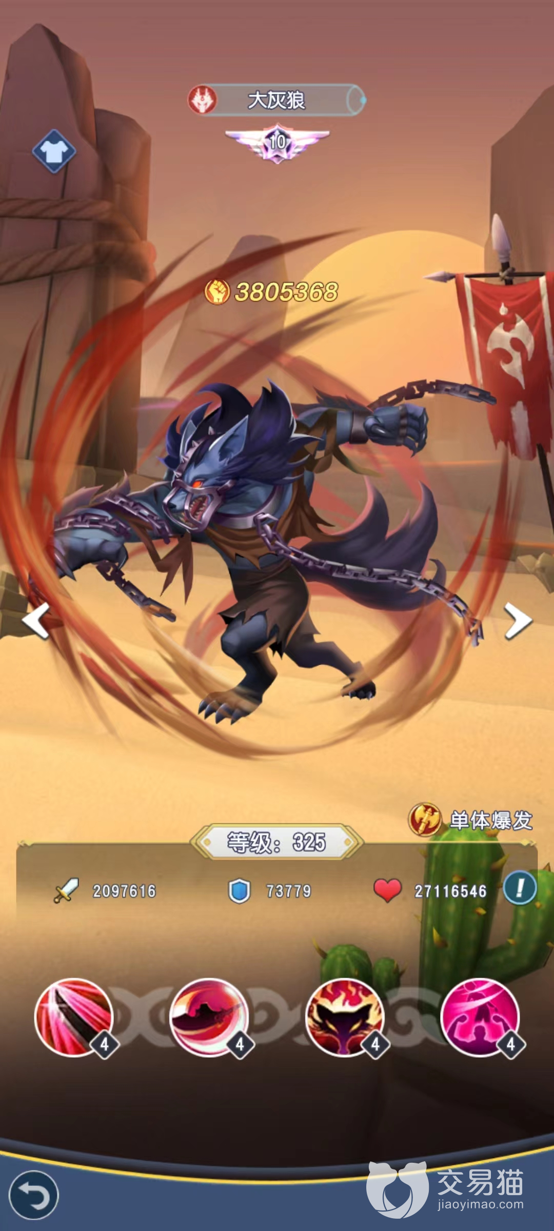 兽族的英雄普遍拥有极高的爆发,而在其中大灰狼是其中非常出色的一个,极其擅长单体爆发。在阵容中如果没有单体技能将很难点杀掉对方的关键人物,大灰狼就充当这一角色,利用主动技能凯撒锐爪直接造成一次海量伤害,同时如果利用技能击杀目标还能够使大灰狼的血量获得提升。当生命值低于半血时进入到狂化状态,持续时间内暴击率提升,暴击伤害提高。