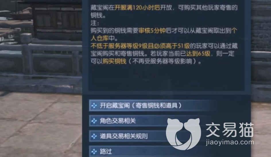 逆水寒手游里面的藏宝阁跟端游一样,都在寄售页面上,点击藏宝阁进去就能搜索、寄卖道具铜钱之类的物品。目前藏宝阁可以交易游戏里大部分非绑定道具,比如,材料,宠物,装备,金币。玩家挂在藏宝阁上的道具一旦出售,金额将会在扣除手续费用之后汇入官方暂存,经过三天公平保护期之后才能提现。
