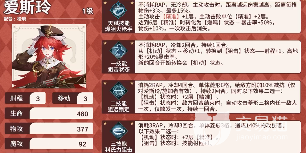 爱斯玲这个角色是一个手拿长枪的少女,她拥有火红的头发,看上去就很是张扬,能为玩家带来更强势的输出效果,射程比较远,他的基础生命以及物攻、魔攻都是比较强的,不过防御能力稍差一些,会心效果比较强势,在战斗的时候可以为我们更好地提升精准度。