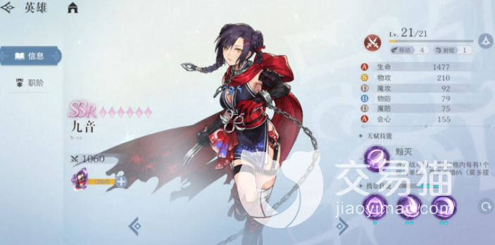 九音目前在游戏内可以使用的武器有两个,分别是圈套以及刃爪,这两个武器主要都以攻击为主,圈套的话可以触发主动攻击以及暴击伤害,刃爪它的触发机制比较繁琐,玩家们需要一定的运气才能触发终极效果,相对而言小编更推荐圈套,这个武器的话能为我们带来更强势的实力,而且目前在游戏内,诡影赤魅也是九音的专属武器,拥有强大的综合生存能力,在PVP对战中也能为我们提供更好的输出效果。