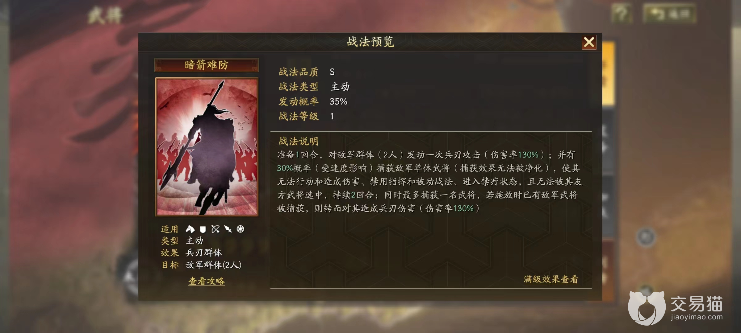 暗箭难防属于s级品质的主动战法,发动机率为35%,最大的特点是为大家提供了一个全新的控制效果——捕获。捕获效果在生效之后可以将敌方一名武将完全控制住,比其他的控制类型要更加全面,使其在控制回合内无法进行任何行动,当然也包括攻击和使用战法等一系列内容。就如同完全脱离了战场一般,并且在造成群体伤害之后,对于被捕获的敌军还将追加一次伤害,这就使得此战法的效果比其他的虚弱,震慑都要强势一些,带来全方位的限制。所以这是一个可以在战斗中创造奇迹的战法,小编认为他非常适合走黑科技路线。