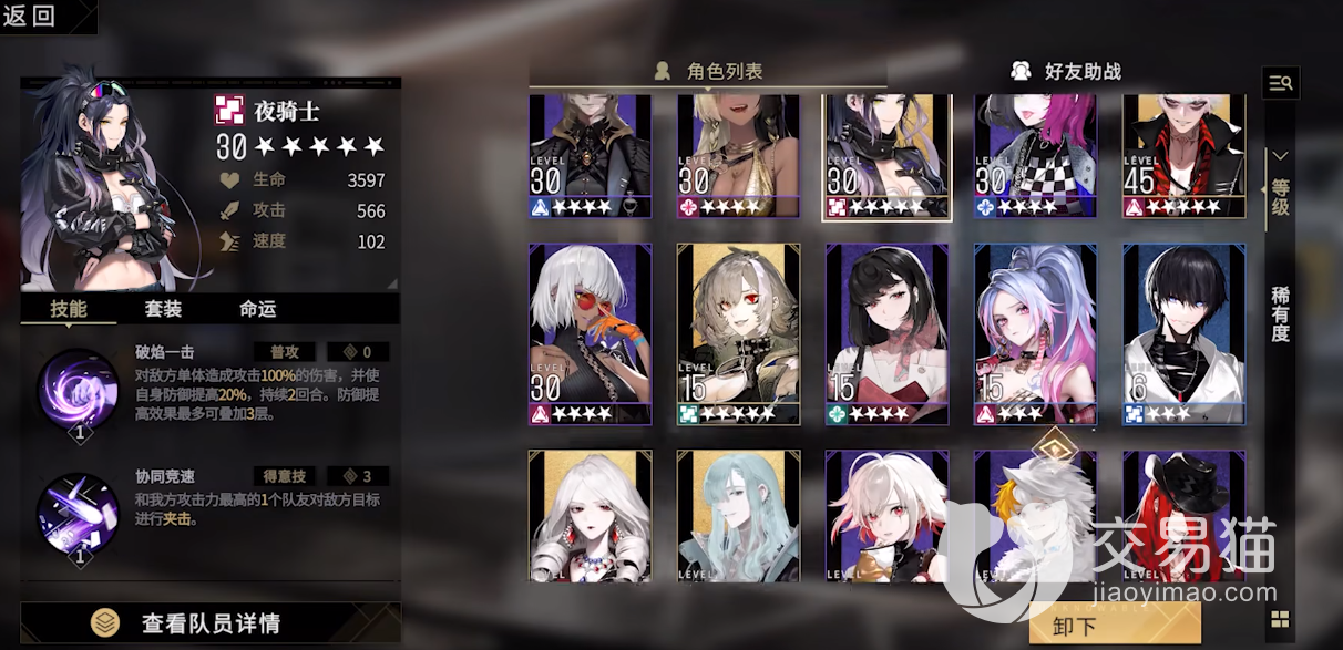 夜骑士是坦克型的角色,大招还能嘲讽敌人,起到保护队友的作用。她拥有的大部分技能都能提升防御属性,主要加入夹击队与同调队伍中,就业范围很广,新手池子建议抽夜骑士。