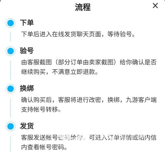 交易过程如果太繁琐,想必小伙伴们会觉得非常麻烦,而交易猫的操作流程则很简便,四个步骤让你轻松买号,流程小编放在下方图片了,大家也可以自己下载交易猫去验证。