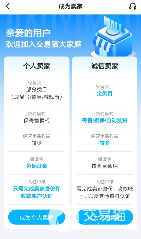 3、而对于已经玩腻游戏的部分老玩家来说,交易猫也支持各位在平台当中进行账号出售,大家要做的只需要去开通一个卖家身份就行,得到了商品发布的权限时,就可以自由发布想要处理的账号信息了。
