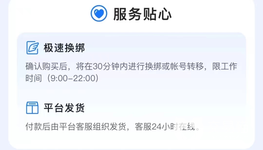 账号交易过程中有许多繁杂的手续,不熟悉流程的玩家如果想独立完成往往需要花费大量时间,并且稍不留意就可能在关键步骤出错而需要重新来过。交易猫平台的服务非常到位,相当多繁杂的步骤都只需要静静等待,客服会高效率地为玩家办妥。9:00-22:00工作时间内确认购买后,很快就能完成换绑或账号转移。