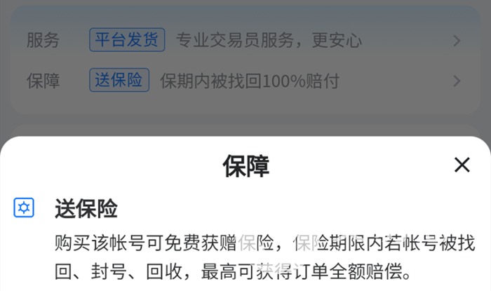 在交易猫中购买商品能够获得很多贴心的保障,享受到极致的服务。有一些商品带有找回包赔的标签,在购买这些账号之后如果出现了账号被卖家找回,是可以在一定期限内找平台申诉获得赔偿。有一些商品也将包赔升级成为了赠送保险,将赔付的范围从找回扩展到了回收、封号等,为我们提供更加坚实的后盾。