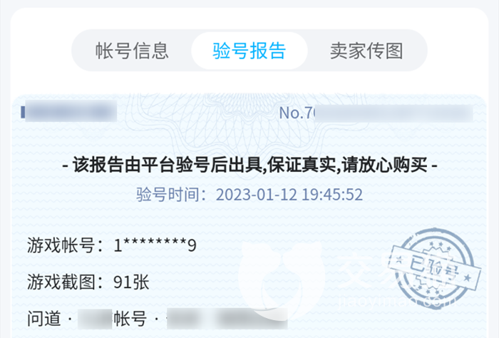 软件中带有一批十分专业的交易员,他们会在账号上架的时候对部分支持的账号进行验证和鉴定,随后通过截图等方式形成相关的报告材料,这些材料将在商品详情描述中展示出来,这就是交易猫的平台验号了。如果大家看到自己想要的商品中带有验号报告,那么安全性基本不需要顾忌,也是给我们打了一剂放心针。