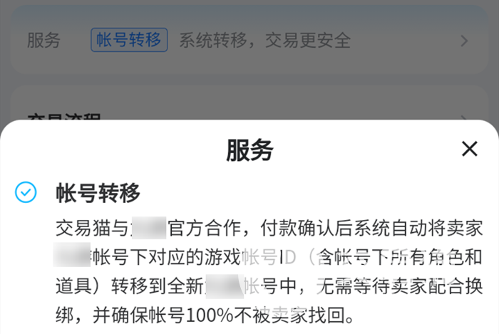 问道这款游戏带有多个渠道服账号版本,其中有一些是支持交易猫的账号转移服务的。所谓的转移其实很好理解,通过某种技术手段将一个账号中的数据和物品转移到另外一个账号中,通过这种方法规避掉账号本身会出现的被找回、被封禁情况。不过如果大家购买了带有转移服务的商品又想要享用的话,记得要自己准备一个空白的账号哦!