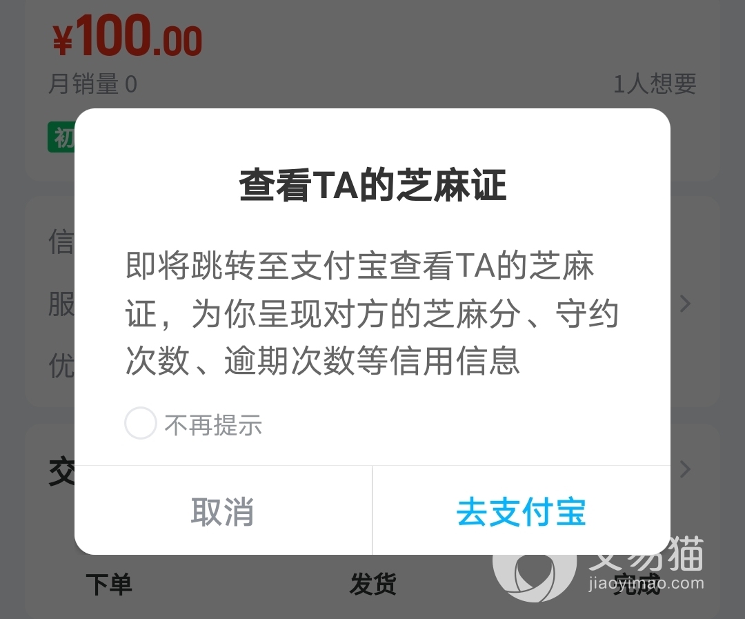在交易猫平台买号还有一项优点为“交易安全”。每一位入驻卖家都须经过真人实人验证,几乎大部分卖家都授权了芝麻信用,买家进入商品详情页找到查看更多,就能跳转到支付宝,看到对方的芝麻分、守约次数、逾期次数之类的,便于大家辩别更靠谱的卖家。