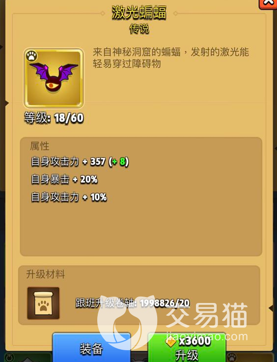 传说级的小弟跟班,其自身攻击力属性在一众跟班中属于上游,激光式的攻击方式特别适合对付远程的一些敌人,尽管攻击方式单一,但自身的暴击和攻击力加成足以弥补这个缺点。当然,更重要的是激光蝙蝠如同他的名字一样,由于发生的是激光攻击,使得他的攻击可以穿越墙壁对于障碍物后面的敌人造成伤害,在某些情况下甚至可以用来逃课,相当不错的机制宠物。
