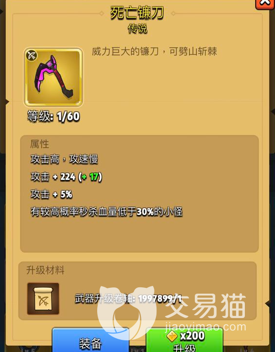 镰刀的定位高攻击低攻速,基本上攻击一下就是一大片,在敌方小怪过多的情况下,真的很像是在割草。基础素质攻击非常高,一级就200多,额外增加5%的攻击聊胜于无,更重要的是它可以秒杀血量低于30%的小怪。这使得它在群体作战中有着不可动摇的统治能力,尽管因为攻速慢的原因对操作有点要求,但是输出方面是真的给足,不愧为传说装备。