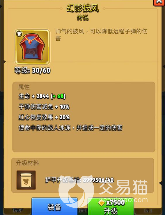 非常帅气的红色小披风,作为传说装备的它可以降低远程子弹的伤害,并且给予玩家高额的生命加成。其独特的被动可以让攻击命中我们的敌人产生冰冻效果,并造成一定的伤害。是一件非常不错的披风装备,唯一的缺点就是不容易获得,其他方面都十分出色。