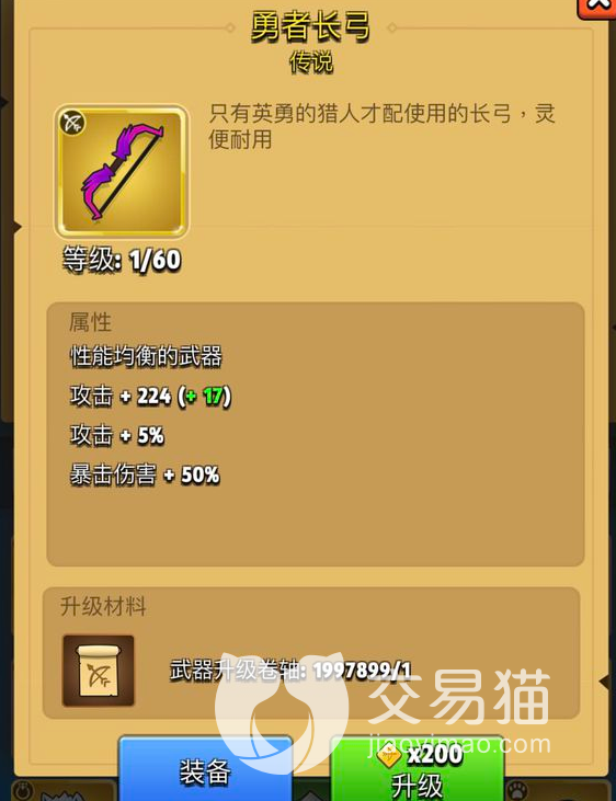 传说中勇者使用的顶级长弓装备,灵巧的外表下方便耐用,相当均衡的一个武器。可以为我们玩家提供高额的输出加成,是目前游戏中最好的长弓装备之一。