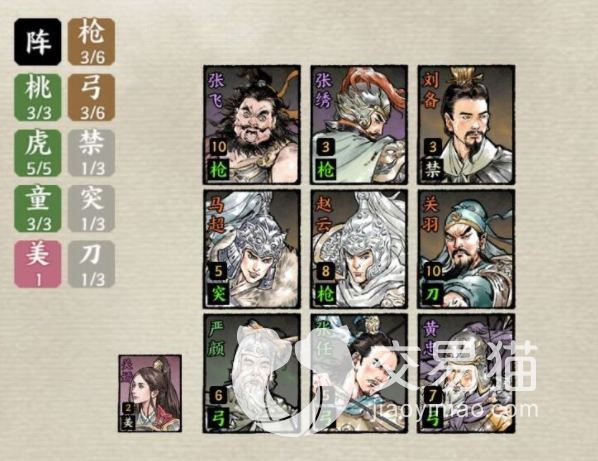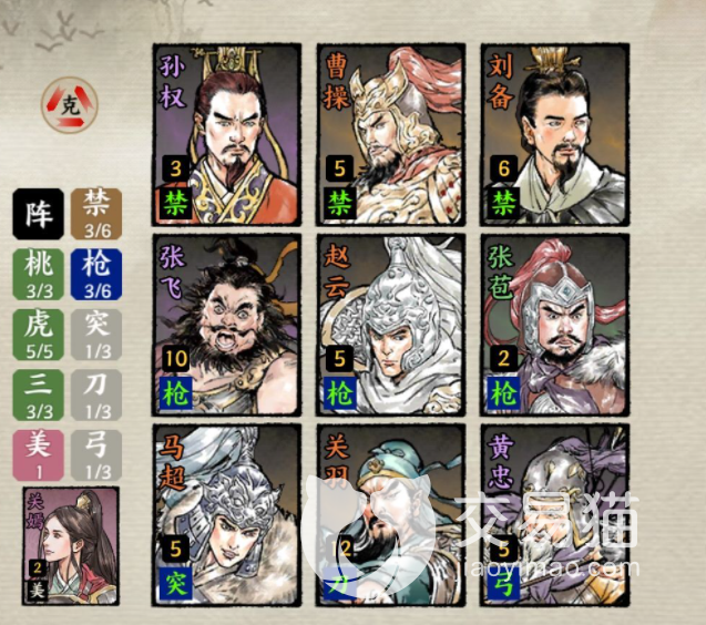 第三个阵容,在英雄的选择上面就多了一些变化加入了以曹操为主的魏国英雄,主要的搭配是魏、蜀、吴的三国主公以及三国的大将。孙权,曹操,刘备三国主公咱们就不多说了,张飞,赵云,马超,关羽,黄忠在游戏当中算是出场率非常高的几个英雄,但是在这个阵容当中多了一个张苞。这个角色很多玩家都表示不太熟悉。的确,角色属于出场率比较低,并且稀有度也不高的角色。但是在这个阵营当中却能发挥出他本身实力的1.5倍,因此玩家们可以发现就算是游戏中再不起眼的小角色,放到合适的阵营中就能打出远超自身实力的输出。