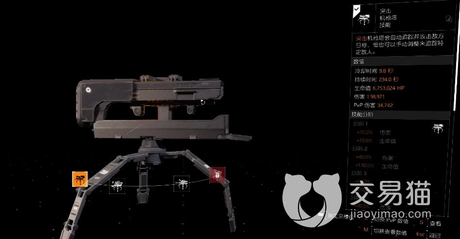 然后是专长方面,可以选择技师专长,可以为我们提供10%的技能伤害和1点的技能分阶。尤其是技能分解可以增加技能数值,每增加一点增加的数值也有所不同。而在奇特装备方面,选择波形枪套,可以为2个技能轮流带来技能伤害加成。而技能方面我们选择“突击机枪”和“前锋无人机”,这两种设施可以自动索敌,并造成持续且有效的输出。在这些技能的右侧可以看到每个分阶给技能带来的加成,让玩家更清楚在哪些方面需要提升。在后来的版本更新里,敌人对机枪塔、无人机的伤害有下调,因此变相延长了这两者的持续时间。