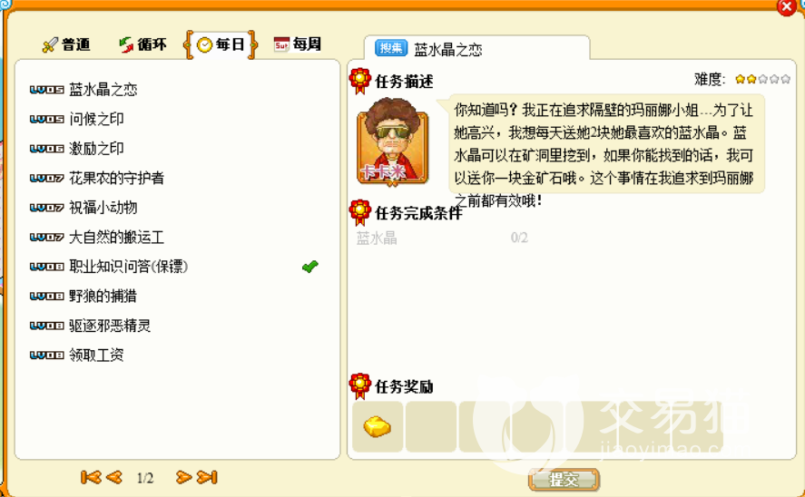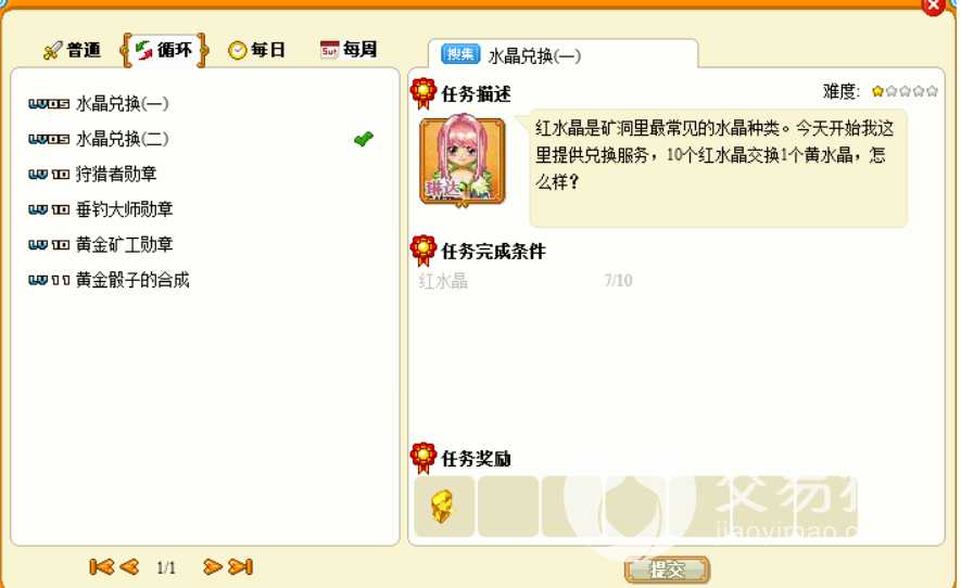 循环任务中经常出现的就是水晶兑换以及狩猎者勋章、垂钓大师、黄金矿工以及黄金骰子,这些任务都是需要经过不断的积累才能够完成的。水晶兑换是五个任务当中最简单的一个任务。基本上都需要玩家获取红水晶十个或者黄水晶十个或者白水晶十个就能够完成任务了。