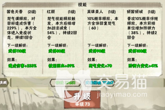 而貂蝉可以优化队伍的站场环境,特别是对于后排,貂蝉可以大幅度提供防御力加成,以防止后排输出被秒,此外他还有一手全体免疫,也就是一回合的无敌,非常好用。对于前排也能提供防御力增加,最重要的是还有一个群体回怒技能,能让队伍更快的进行下一轮技能释放,也是一个高强度角色。