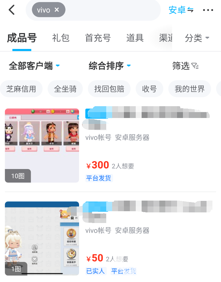 部分交易平台中,针对个别游戏,其区服数量有限,尤其是一些比较冷门的区服,可能不会有账号在售。但在交易猫平台上,能看到多种服务器的账号,小编简单搜索了一下,就比如我们要找的迷你世界vivo服,在交易猫中能搜到大量账号,其中也包括超富账号,与此同时这些账号价格各异,可供用户们尽情挑选,除了超富的之外还有资源比较一般的,光是这一点,足以领先不少其他交易平台。