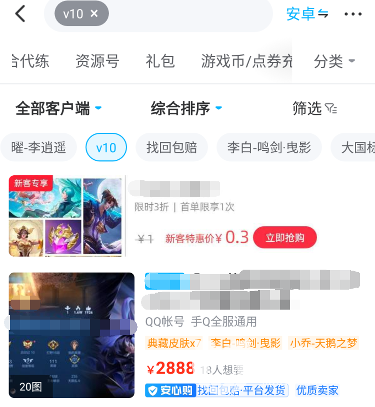 很多小伙伴都有过这样的感受,进入交易平台后,直接被眼前花里胡哨的账号弄的是晕头转向,不知道该怎么选择,尤其王者荣耀上架的账号数量很多,想找理想的账号也不方便。但在交易猫中不存在这样的困扰,平台自带筛选功能,小伙伴们在浏览的时候,只需要在搜索栏中输入“v10”,接下来系统会自动为大家进行筛选,往下看到的账号就统一都是v10了,这样的话大家就可以根据每个账号的细节内容,了解一下买个v10账号究竟要花多少钱。
