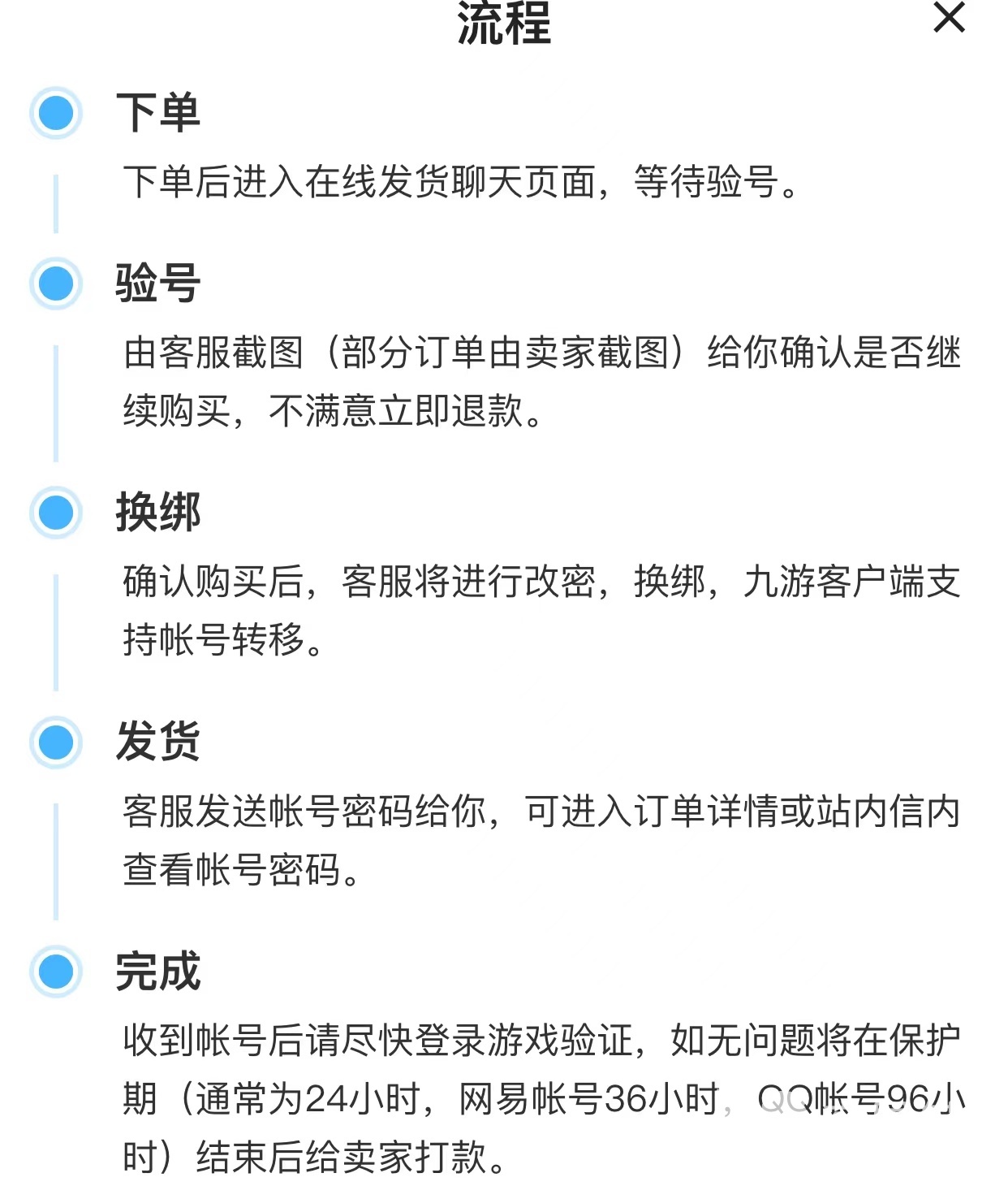 在买家选择好心仪的商品后就可以直接拍下了,之后进入到在线发货的界面,由24小时全天在线的专业客服引导交易,客服上号验证账号是否真实,然后给买家截图确认,不满意还可以马上退款,确认后就可以进行换绑和改密的操作了。交易成功后还有保护期,保护期结束平台会给卖家打款。总的来说,是简洁又安全的交易流程。