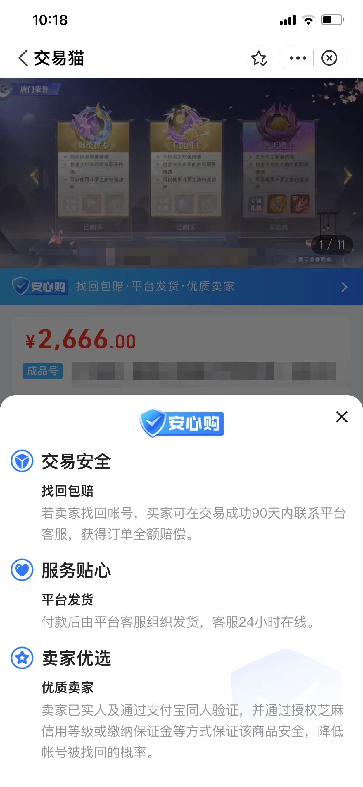 交易猫中的部分账号所拥有安心购,如下图所示,在交易完成后,如果卖家找回了账号,那么买家就可以在交易成功90天内联系平台,就能获取到订单的全部赔偿,最大限度保护账号安全。交易时还可以选择优质卖家,让交易更加放心,降低账号被找回的几率。