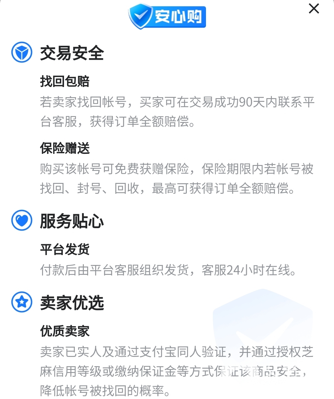 交易猫平台除了要求卖家进行真人认证、绑定同实名的支付宝等要求外,一些商品还有多项保障服务,比如安心购,附带有找回包赔、保险赠送等保障。有安心购标识的商品都是由平台通过一定规则筛选出来的商品,买家买起来更安心。