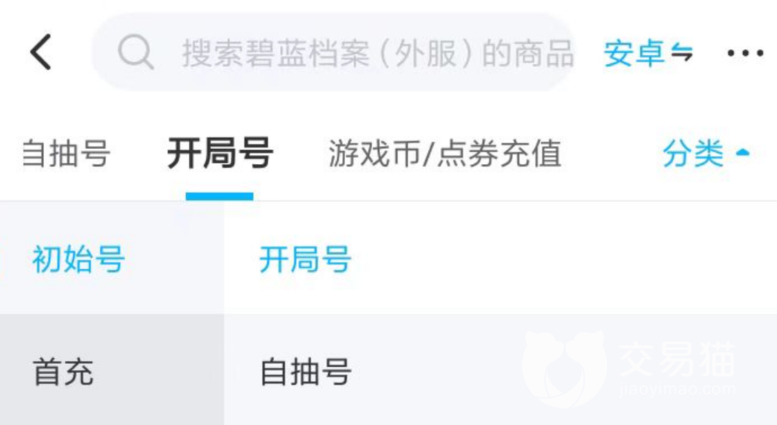 1、在交易猫平台当中,初始号也将细分为两种不同的游戏号类型,分别是开局和自抽号。开局号往往已经为大家提供了一个不错的游戏开局,玩家们在使用的时候直接体验游戏即可。而后者自抽号,则是为玩家提供大量招募角色的机会,让各位自己去招募高级角色。