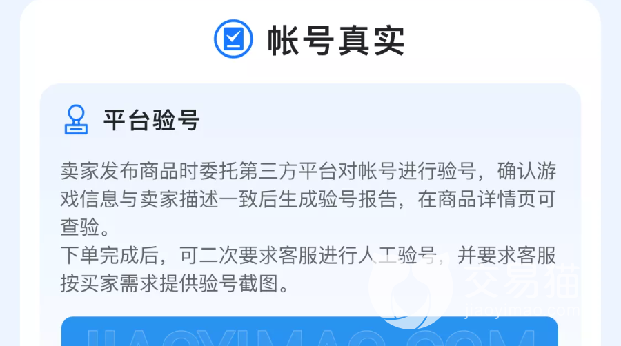 所有的验号,发号,解绑换绑流程都在交易猫平台内实现。玩家可随时查看交易进行到了哪一步,过程透明。 同时每一位卖家买家都必须进行实名认证来提供交易安全的可靠性,安心购服务和找回包赔服务更是一站式解决了玩家对于账号交易的所有顾虑。