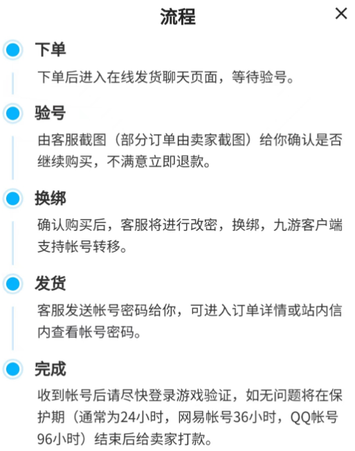 没有规矩难成方圆,交易猫在经过九年的改进和升级之后,也是终于制定出一套完整的交易流程,将看似复杂的过程拆分成为五步,如果买家无需进行验号要求的话,也会大大缩短交易的时间,其中进行的每一步,都是有客服进行严格的把控,具体的内容都可在首页中找到。