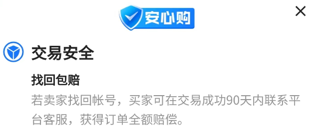 交易猫之所以能一直维持住较高的安全性,主要还是通过部分商品中自带的安心购保险,安心购不会体现在每一个账号上,但往往有体现的都是优质卖家,这种账号都会自带九十天的找回包赔服务,在此期间要是一旦被找回的话,买家是有权利追回全部的号款,还会让商家无法继续在交易猫出售商品。