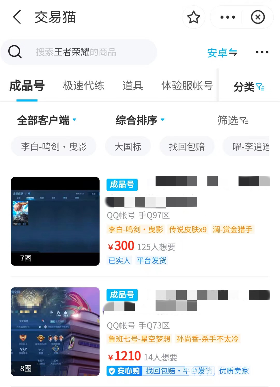 那么该如何估价呢,你可以通过观察交易猫的其他账号来为自己的账号进行初步估价,在交易猫中进行搜索,你就可以找到大量和你账号相类似的账号,这时你就会对你的账号价格有一个初步的判断,但此时的的价格并不准确。