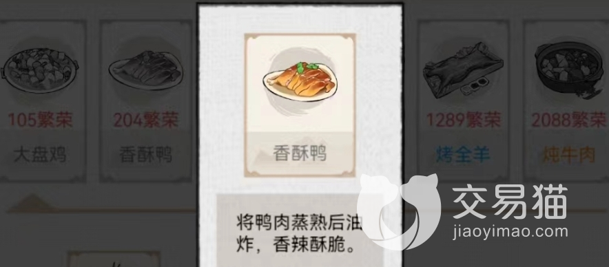 说完主食肯定得有硬菜,这款游戏综合了全国各地大部分地区的美食,比如大盘鸡,大盘鸡的成交价格在248~1287左右,香酥鸡是242~1448,烧鹅就比较贵了,烧鹅是1000~4000不等,在现实中烧鹅这个菜品也是比较昂贵的硬菜,还是那句话,玩家们自行考虑购买,一定不要挖空自己的钱包。