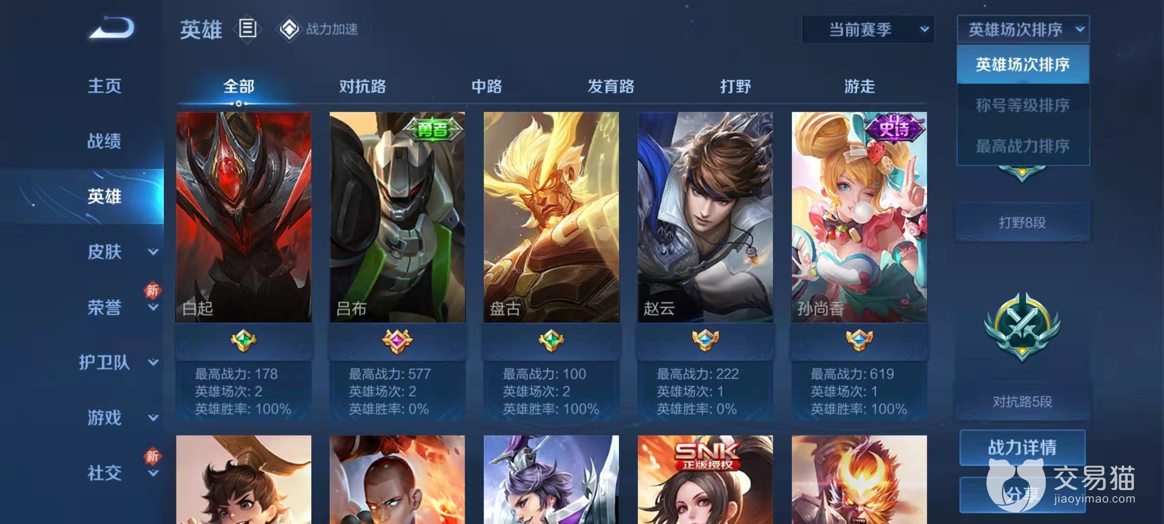 当然,这个熟练度只是获得全能称号的条件之一,而且全能称号本身是有分级的,想查看自己现有的全能称号等级的话,需要回主页点击召唤师头像,然后点击“英雄”,然后再点击接下来所出现界面右下角的“战力详情”选项。