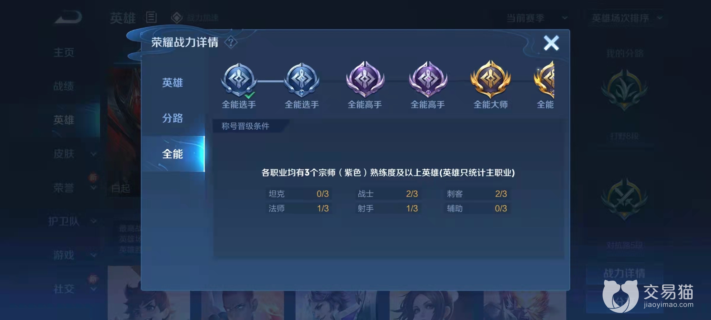 可以看到,全能称号从低到高分为“选手”,“高手”和“大师”三个级别,如果你只是想要最低级的“全能选手”称号,那么只需要让每个位置都有三个紫色熟练度以上的英雄即可,当然,到紫色少说也得打个五十把甚至一百把,所以整体过程还是有一些漫长的。至于后面那些高级的称号,则除了熟练度达到标准以外,还得你的位置分段上去,这个是达到条件的英雄越多,提升的就越快的。