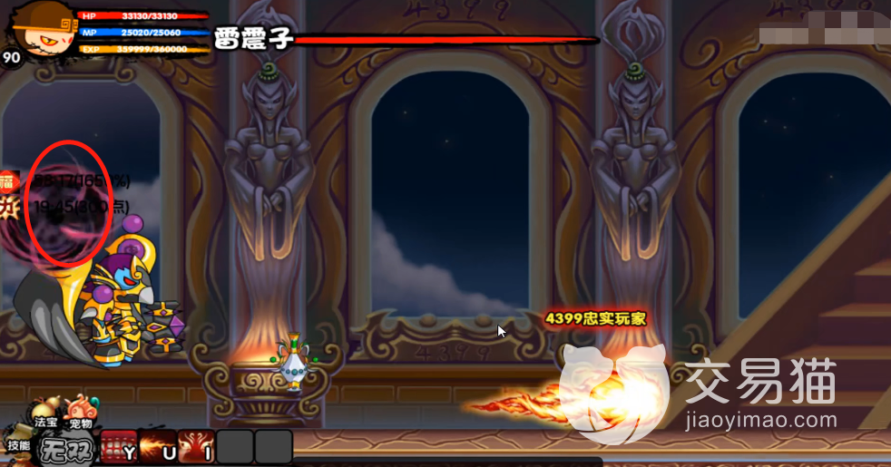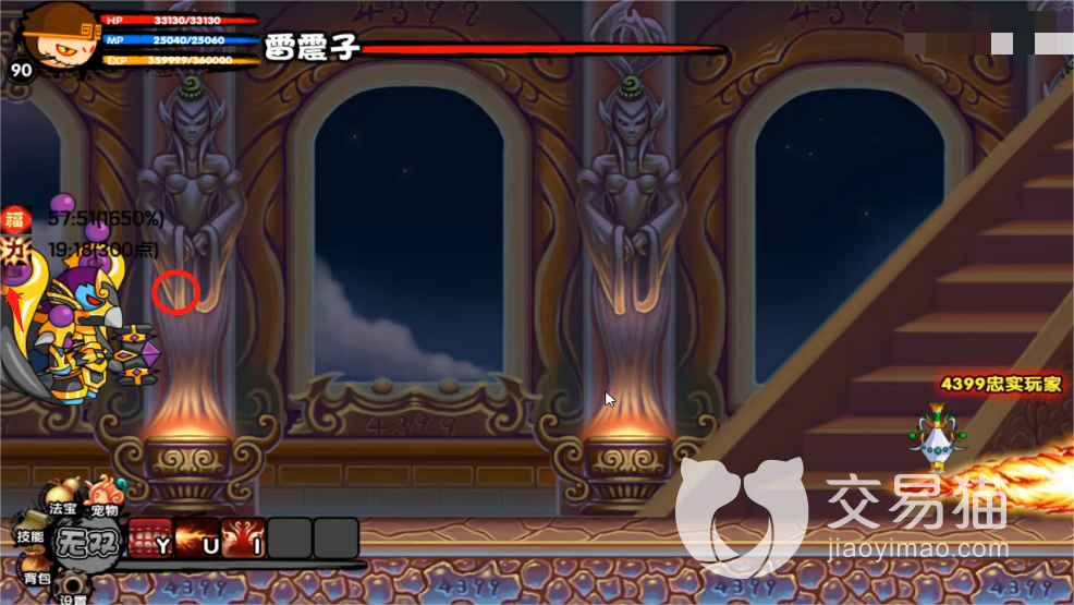 不过这期间也有一些需要注意的点,那就是使用烈焰闪的时机,首先就是进副本但雷震子还没出场的这个时间,玩家在这时需要一直往地图左边使用烈焰闪,因为只有这样才能进入不可选取状态,从而躲避被雷震子吸走。而在雷震子出场,并即将施放黑洞的前一刻,则需要玩家连续使用烈焰闪冲到地图最右端,最好是等雷震子走到如图所示那尊石像前的位置,然后不断向右使用烈焰闪即可。当然,这个不用按太久,只需要拖十秒,等到左端黑洞的边边角角消失以后,就可以回头使用火眼金睛反打了。
