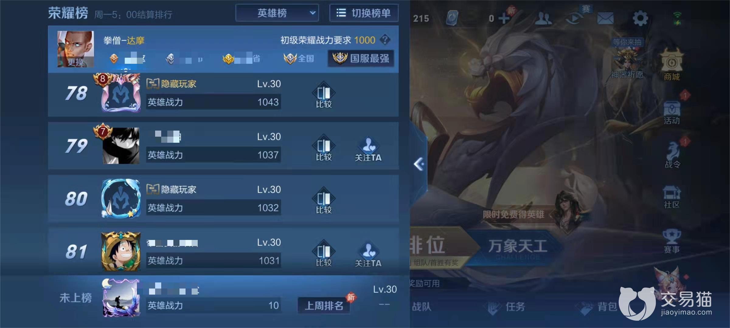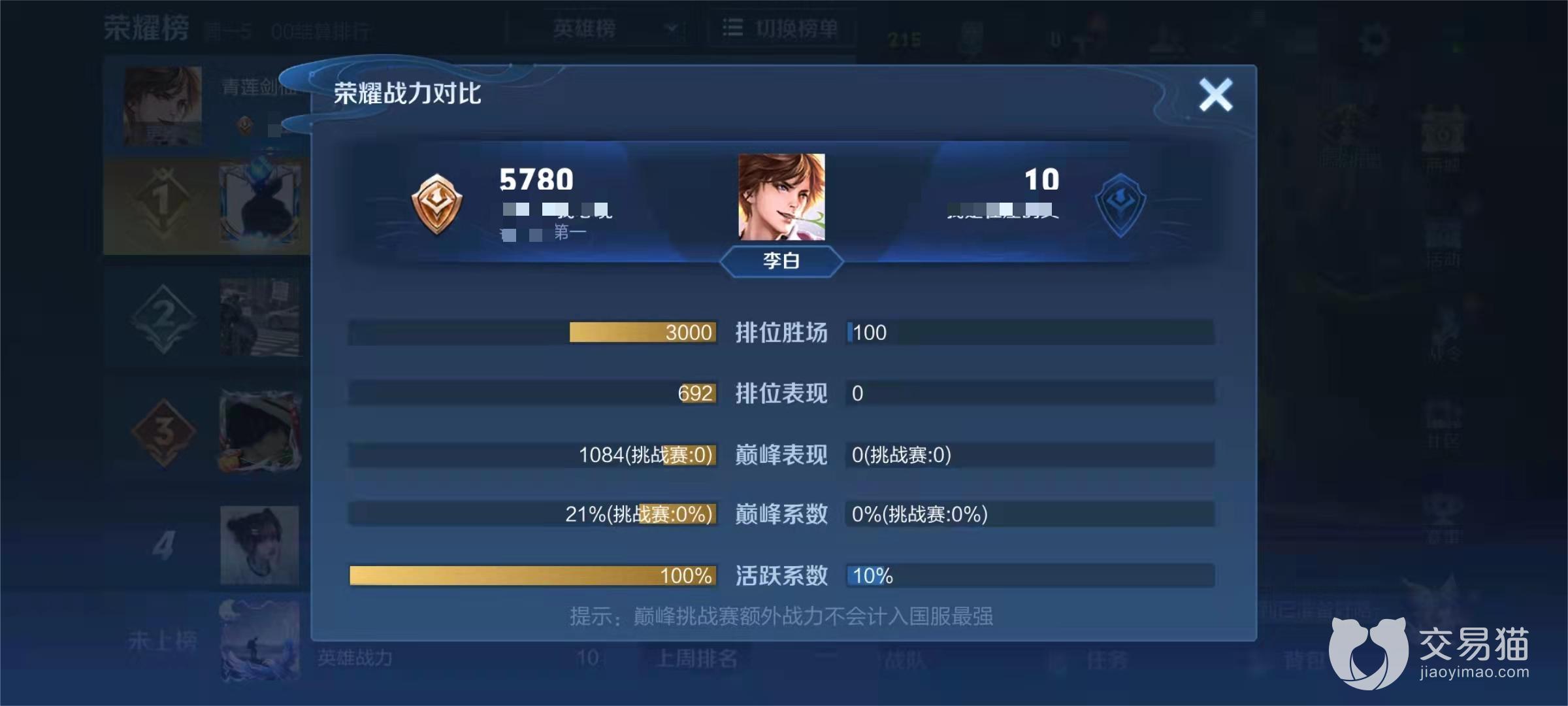 荣耀榜的位置直接决定了你能否获得百强称号,一般来讲区级的前一百还是很容易达成的,毕竟小区总人数少,再除去不玩王者的那些人后,你只需要平常把一个英雄多打几把,战力就能上去,区级的话前一百只需达到1000战力左右即可,迅速提升战力的办法有打排位,打巅峰赛和保持活跃度这三种。
