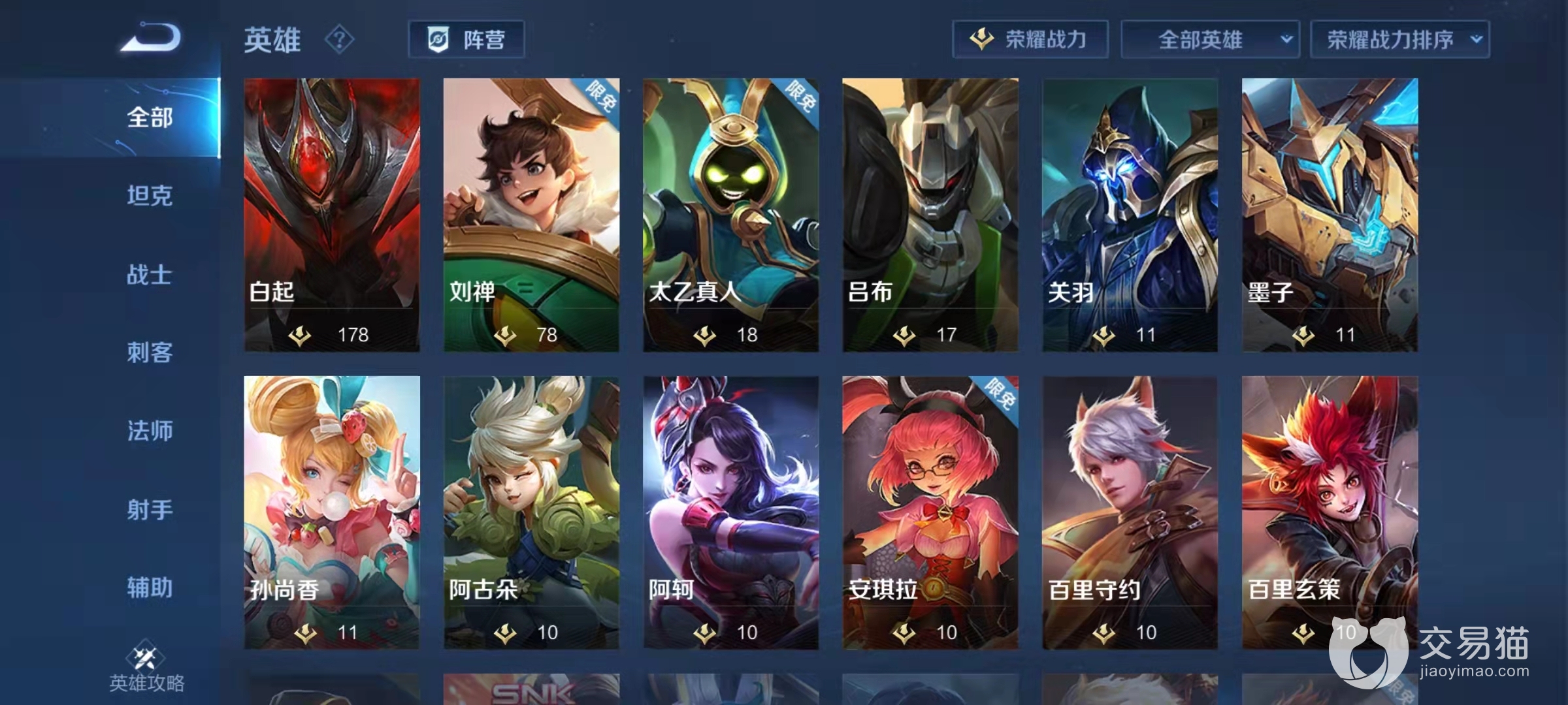 想获得百强称号,需要玩家的荣耀战力达到当前区域的50~100名,不过这个百强对于每个英雄都是分开算的,所以每个英雄的战力都各不相同,这点可以从主界面的“英雄”点进来查看。进去后再点击右上角,将战力显示出来,然后再将排序方式调整为荣耀战力从高到低的降序,即可看见自己目前战力最高的几个英雄。