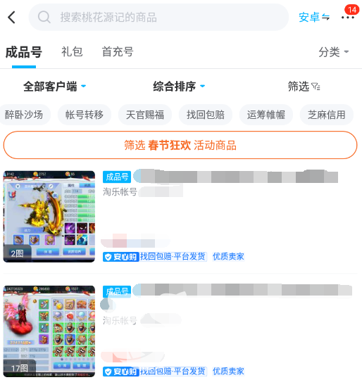 操作简单这一点,相信有使用过这个平台的用户都能体会到,比如玩“桃花源记”的小伙伴们,在搜索这个游戏以后会出现一系列与之相关的商品,然后我们可以点击下方词条,快速筛选出自己需要的账号。