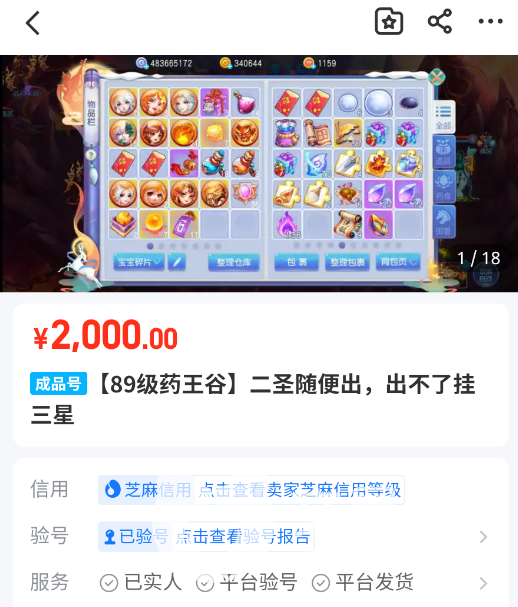 我们还可以选择有“平台发货”“优质卖家”的选项,然后出来的商品账号就会比较有安全保障,而且在我们点进这类商品的详情页之后,还可以点击查看商家的芝麻信用以及验号报告,可以让我们再一次确认卖家的账号详情。