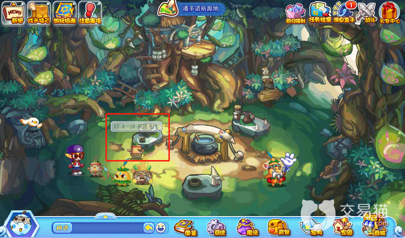 潘多诺格源地处在一片巨树笼罩的林地上,野生的图腾飞侠通常会分布在地图的左侧,它们的头上显示着等级,想抓的话直接点击即可进入战斗,建议抓的时候先打至残血然后再使用咕噜球,这样概率会高一些,另外,在抓完后还能看到它的等级,性格,属性和各项天赋,想抓极品的朋友可以多试几次。
