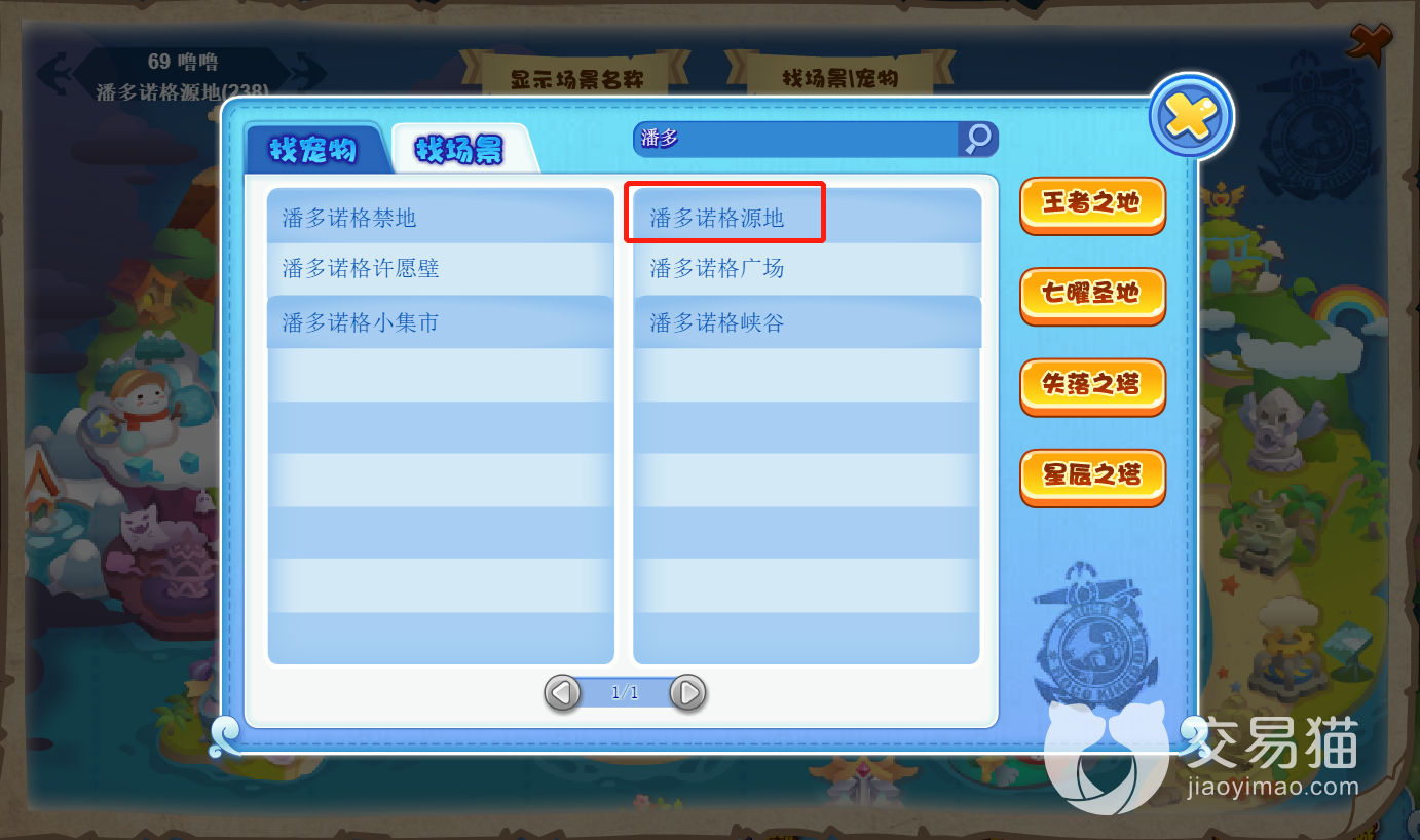 而它的具体分布位置就相对有些偏僻了,它分布在一个名为“潘多诺格源地”的区域,这个区域在拉布朗矿山内,当然,大家如果直接去世界地图里面一个个翻,可能效率比较低,所以建议朋友们在点进世界地图以后点击右上方的“找场景/宠物”功能,然后直接搜索即可,如上图所示,搜索“潘多”以后就会出现源地的相关索引,大家直接点击它即可进入其中。