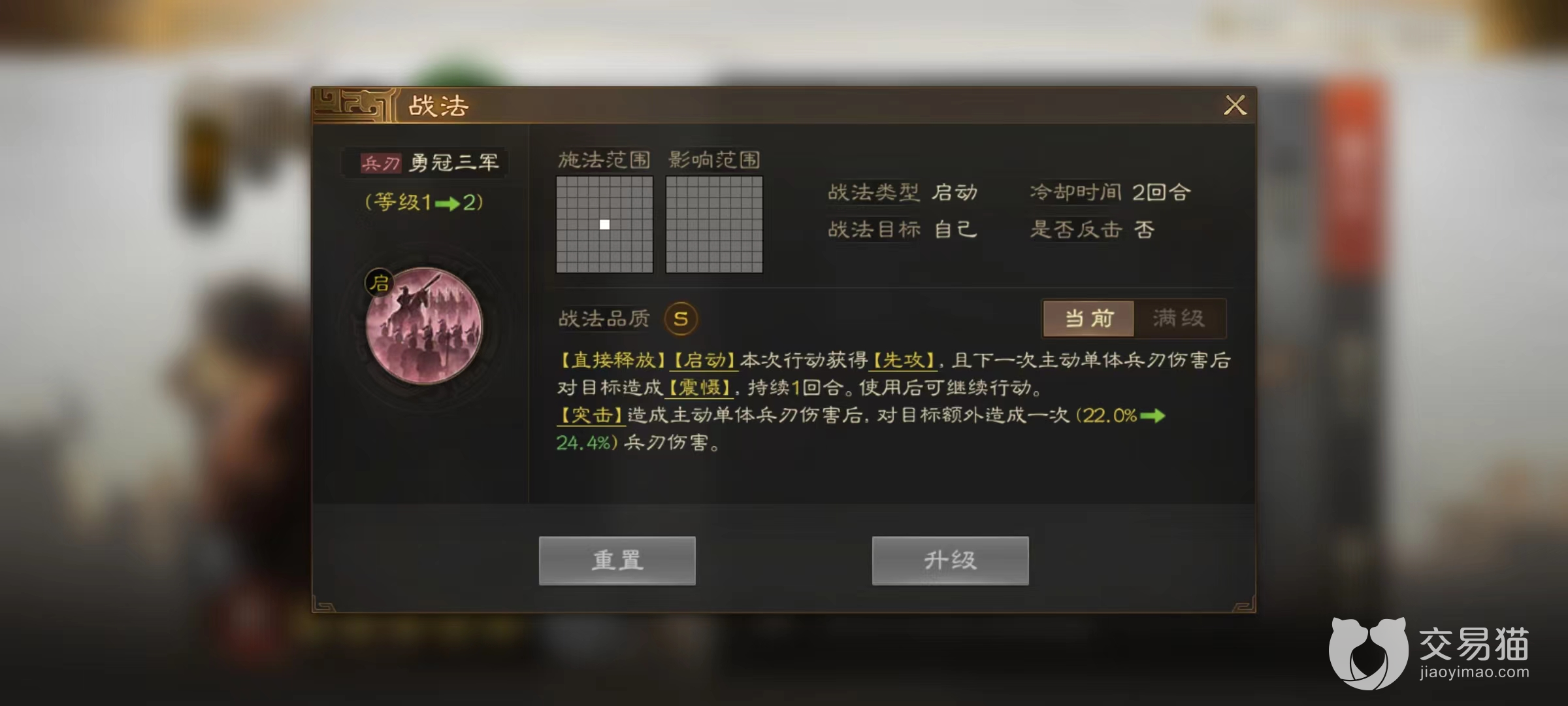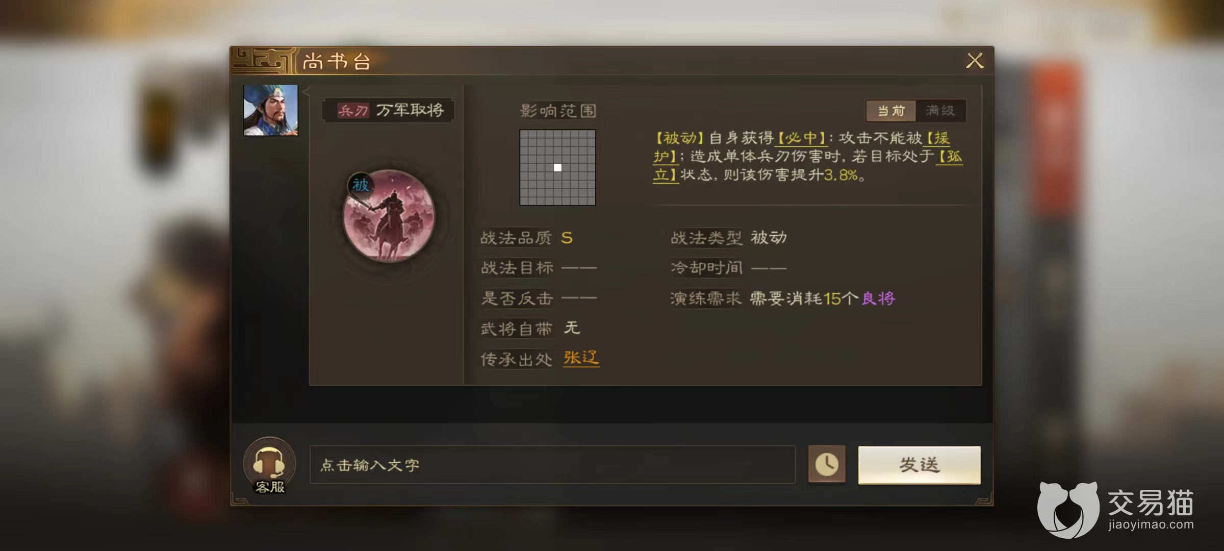 这样的颜良处于最理想的状态,能够将自身的武力、统率和自带战法效果很好的发挥出来,但是需要后期才能实现。在前期如果抽到了可以暂时先用a级品质战法替代,也有很多合适的类型。例如无双上将,手起刀落,短兵相见等。这三个紫色战法和上面的两个橙色效果相差不多。无双上将是非常适合的一个选择,在造成伤害前使自己的武力值提升,对处于控制状态的目标还能额外降低统率值,颜良自身的震慑同样属于控制状态,这样自己就能形成一个循环。