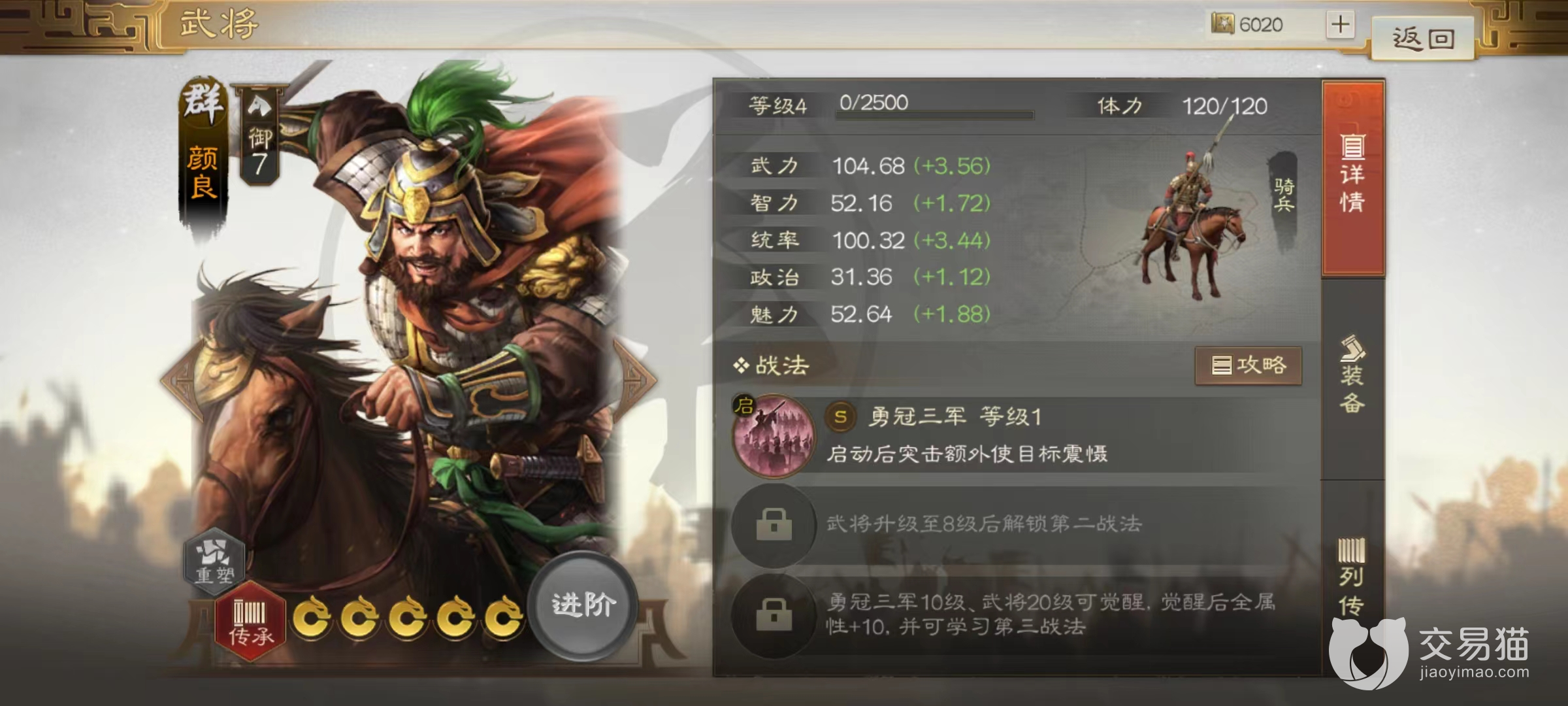 首先来看一下颜良的基本情况,从面板中可以看出拥有非常优秀的武力值和统率值以及对应的成长数值,这样就有了发展起来走后期的基础。再看一下自身携带的战法勇冠三军,属于启动型的战法,直接释放之后本次行动获得先攻状态,在先攻的增益影响下,颜良的普攻和战法攻击均不会受到来自对方的反击,并且还将在下一次伤害后对目标造成额外的震慑效果。