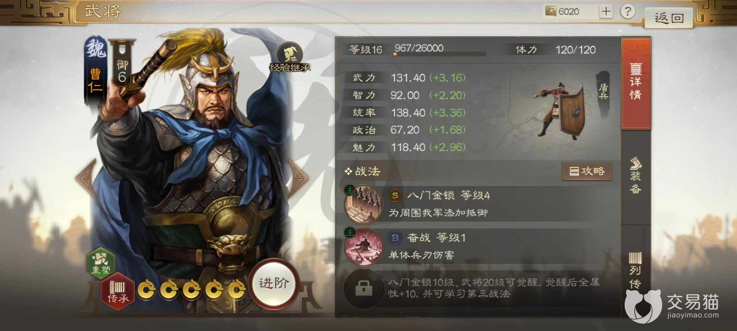 小编给大家推荐的武将主要有马超、夏侯敦、曹仁。这些武将中曹仁属于开服后第2天就能自动获取的免费武将,作为很多新手的第1个橙将,自身实力其实非常可观,最关键的是属于很好用的团体防御型角色。开启战法八门金锁后能够援护自身周围的其他武将,帮助他们抵御一次伤害,在前期开荒阶段拥有奇效。而且自身也拥有很好的统率值和武力值,在前排扛伤害打输出都非常好用。