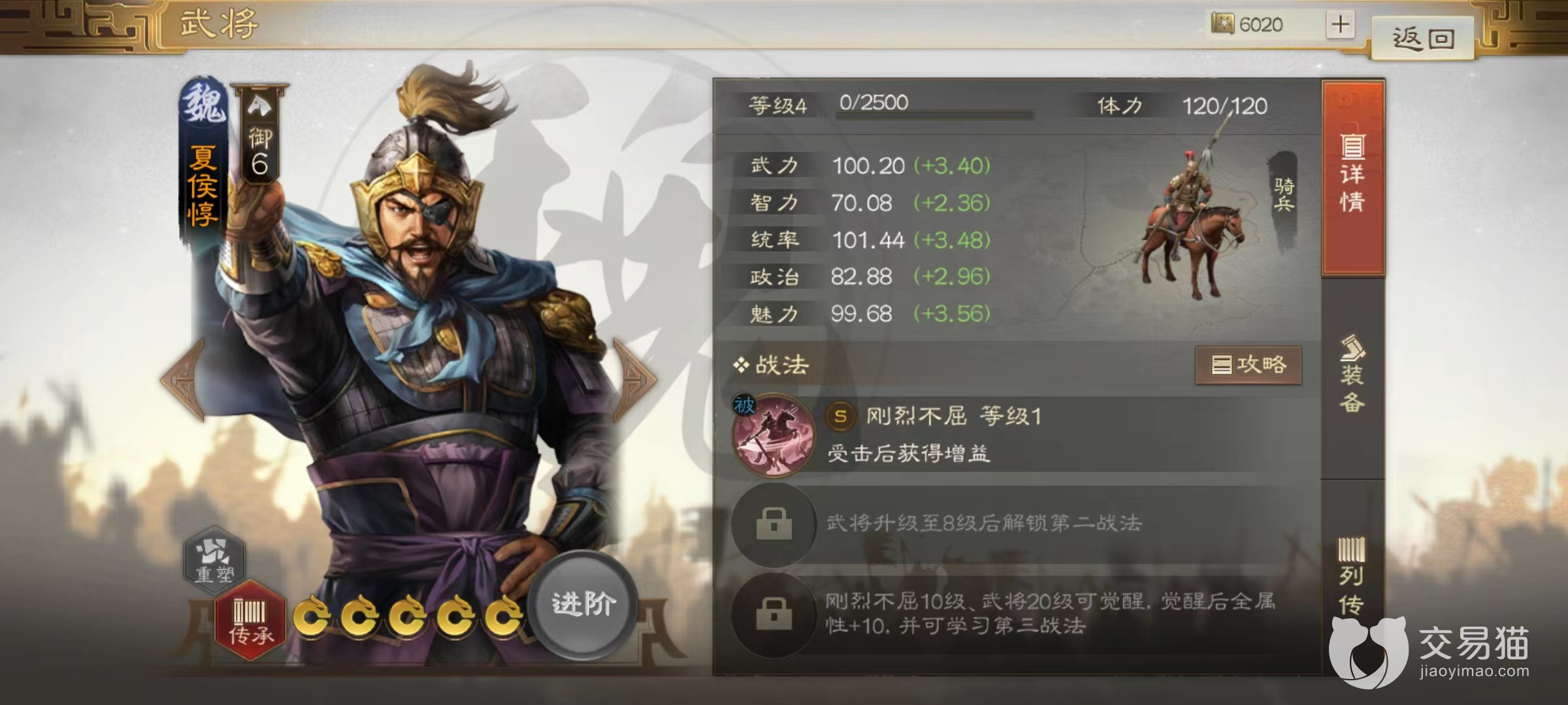 夏侯敦是武力值和统帅值都很高的前排骑兵武将,自身战法刚烈不屈,在受到伤害后可以使自身造成的伤害提升,免伤属性提升,并且获得吸血效果。使用夏侯惇同样极其简单,只要放到前排让他去承担伤害就能自己叠加属性打出非常可观的输出。而且在战法搭配上甚至可以走全被动的路线,非常省心,极其适合前期开荒选择,能够显著降低兵力损耗,提高效率。