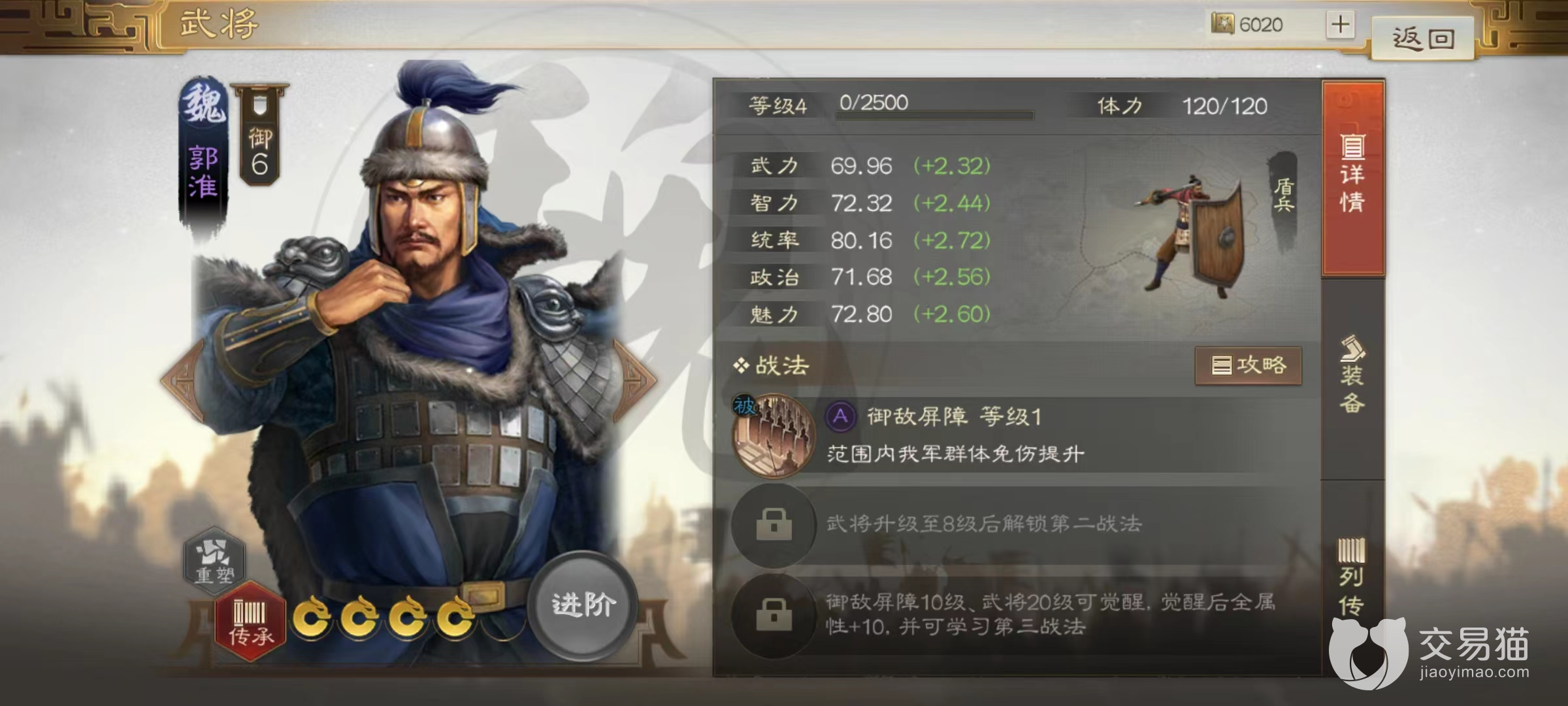 郭淮是左小编非常喜欢的防御型紫色武将,自身战法御敌屏障,属于被动生效的光环类技能,对周围四格范围内的我方所有武将提升免伤属性,达到满级时可以有8%的效果,单这一个效果就能降低很多兵力损耗,也是开荒神将。